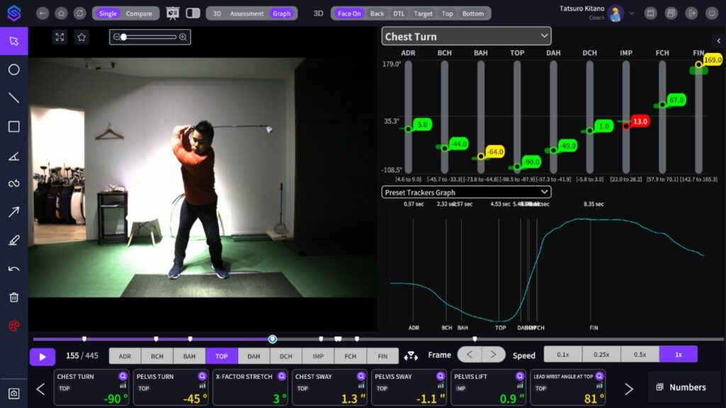 ブライソン・デシャンボーをはじめ、多くのツアープロやコーチが導入しているSPORTSBOX AIでは、身体の回転角度、左右の移動距離、身体の上下動などトラックマンでは計測できないスイング時の身体の動きを計測できます。